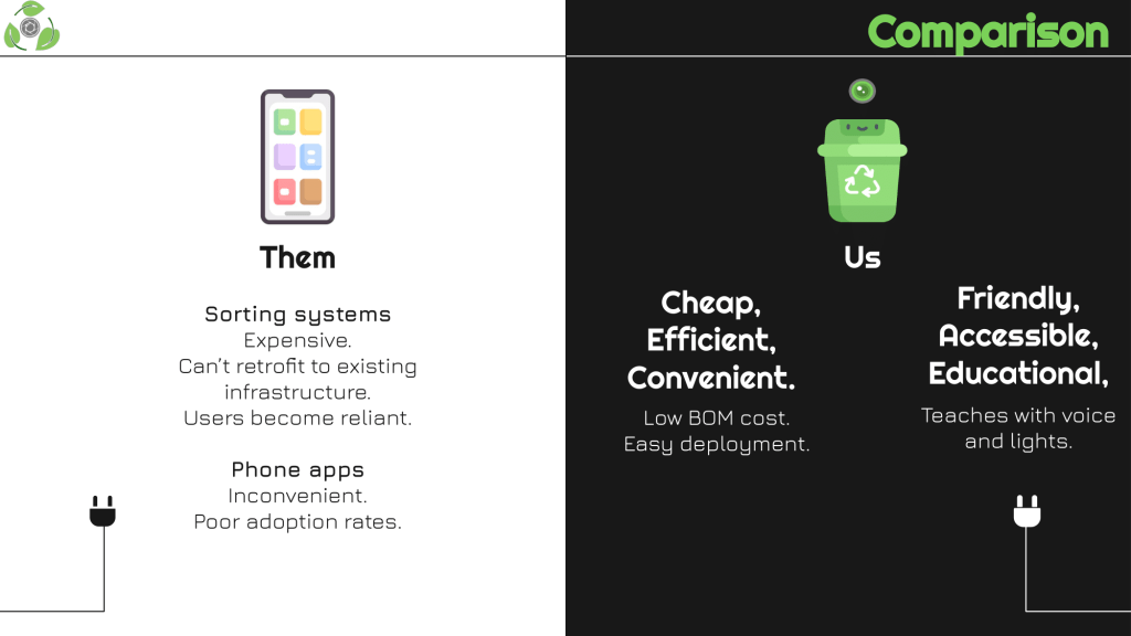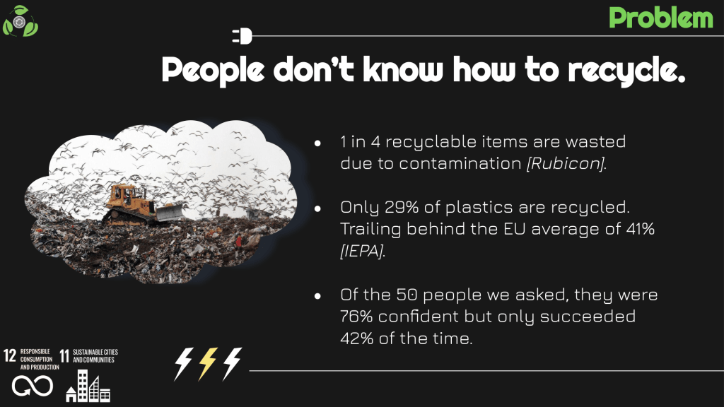 This was part of the HUAWEI Seeds for the Future competition. Our task was to come up with a business idea that was aligned with one of the Sustainable Development Goals. We chose responsible consumption and production. Our product consisted of an AI trained camera, that would recognize to which bin different items belong to. I was responsible for designing the slide deck using PowerPoint. Initially, it had different animation, but we had time constraints, so we opted for a plain deck without animation to save time.
